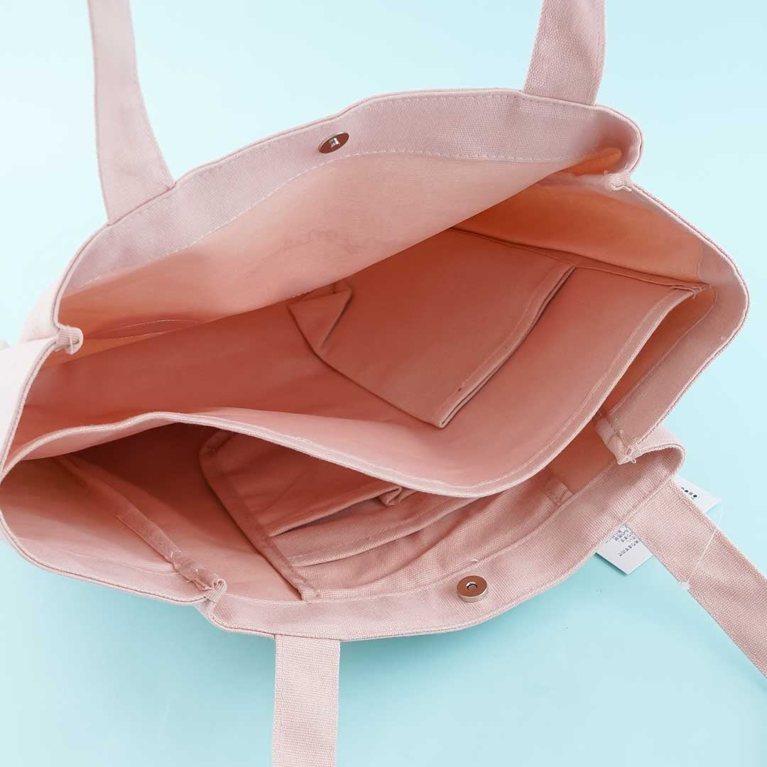 Complete your kawaii outfit with this cute canvas tote! This super cute bag has lots of inner pockets to keep your things separate and organized. It even has a dedicated water bottle pocket, a magnetic button closure, and can fit even A4-sized items. The tote features fluffy My Melody head designs doing different facial expressions on the front!
