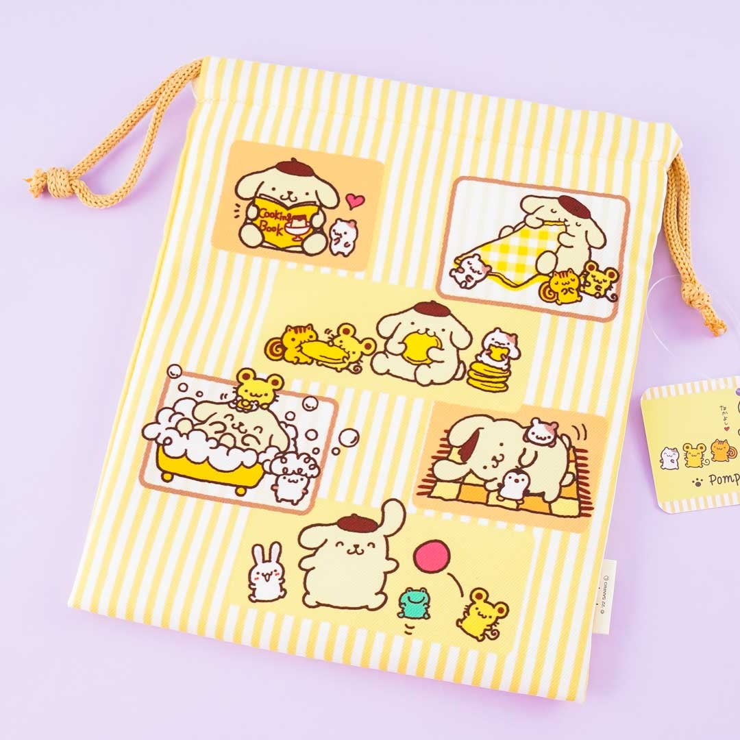 • A cute drawstring pouch with prints on both sides featuring Pompompurin doing daily activities with friends