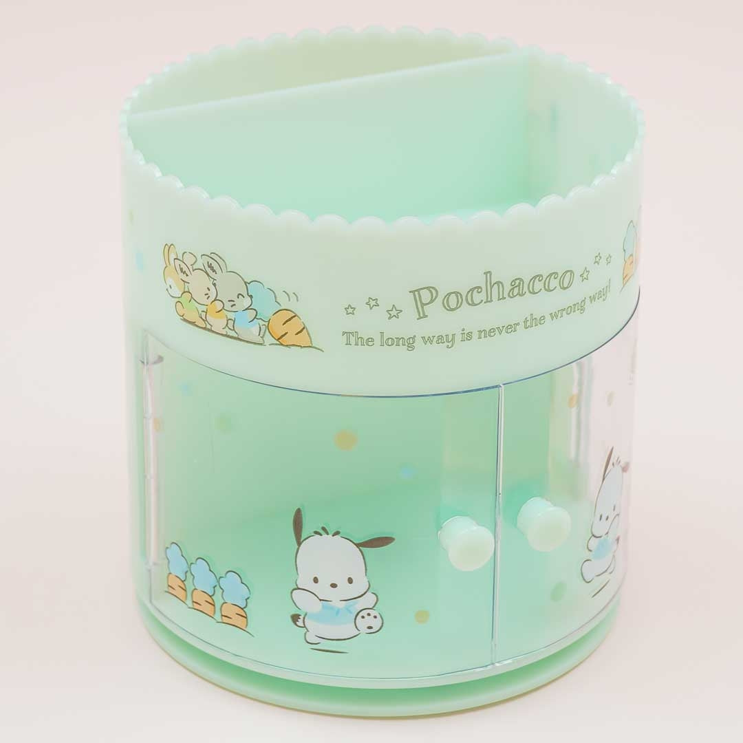 Organize your makeup using this super kawaii cosmetic rack. It features prints of Pochacco hanging out with his friends! This rack has inner storage with a transparent door, a top compartment, a brush stand, and a 360° rotating mechanism for better access.