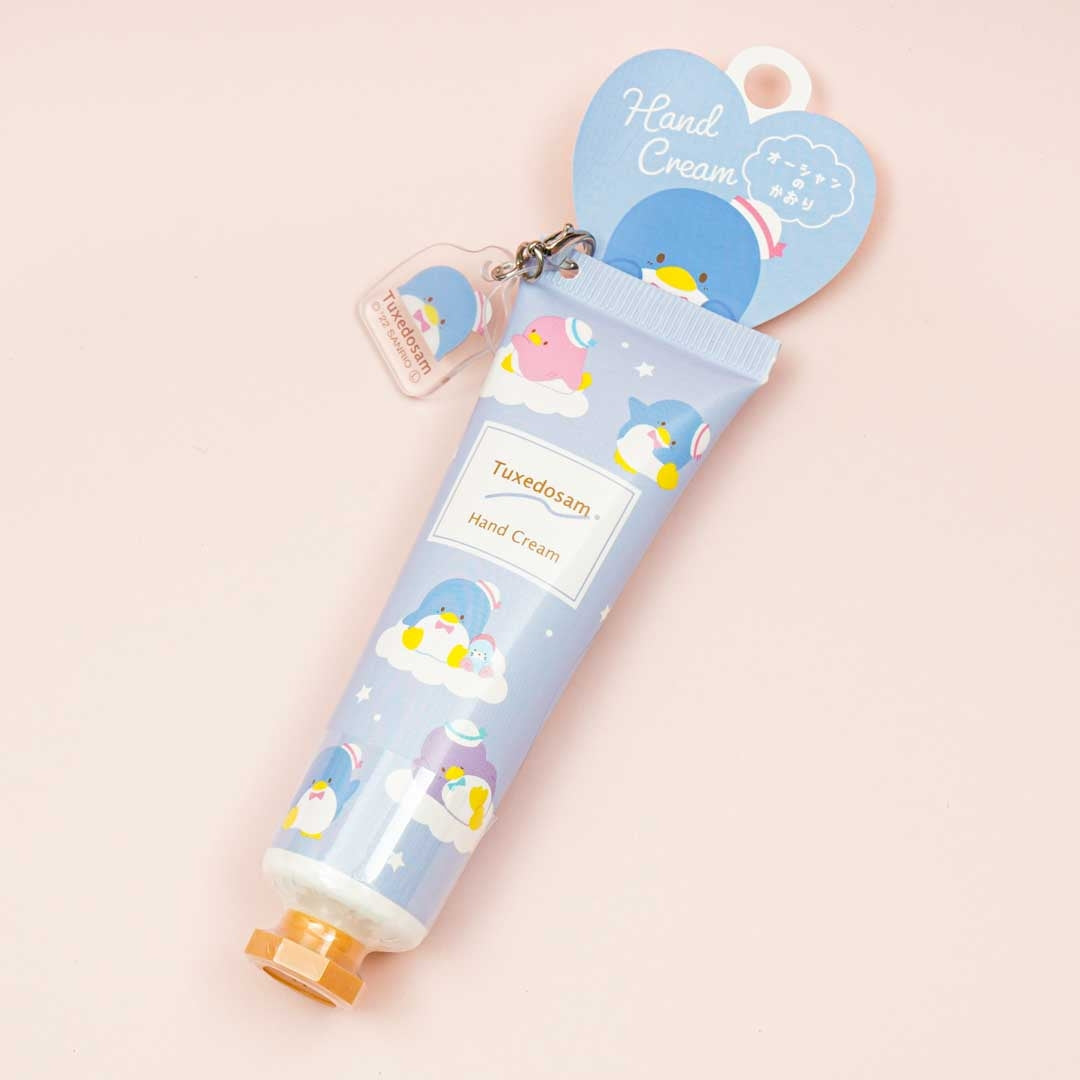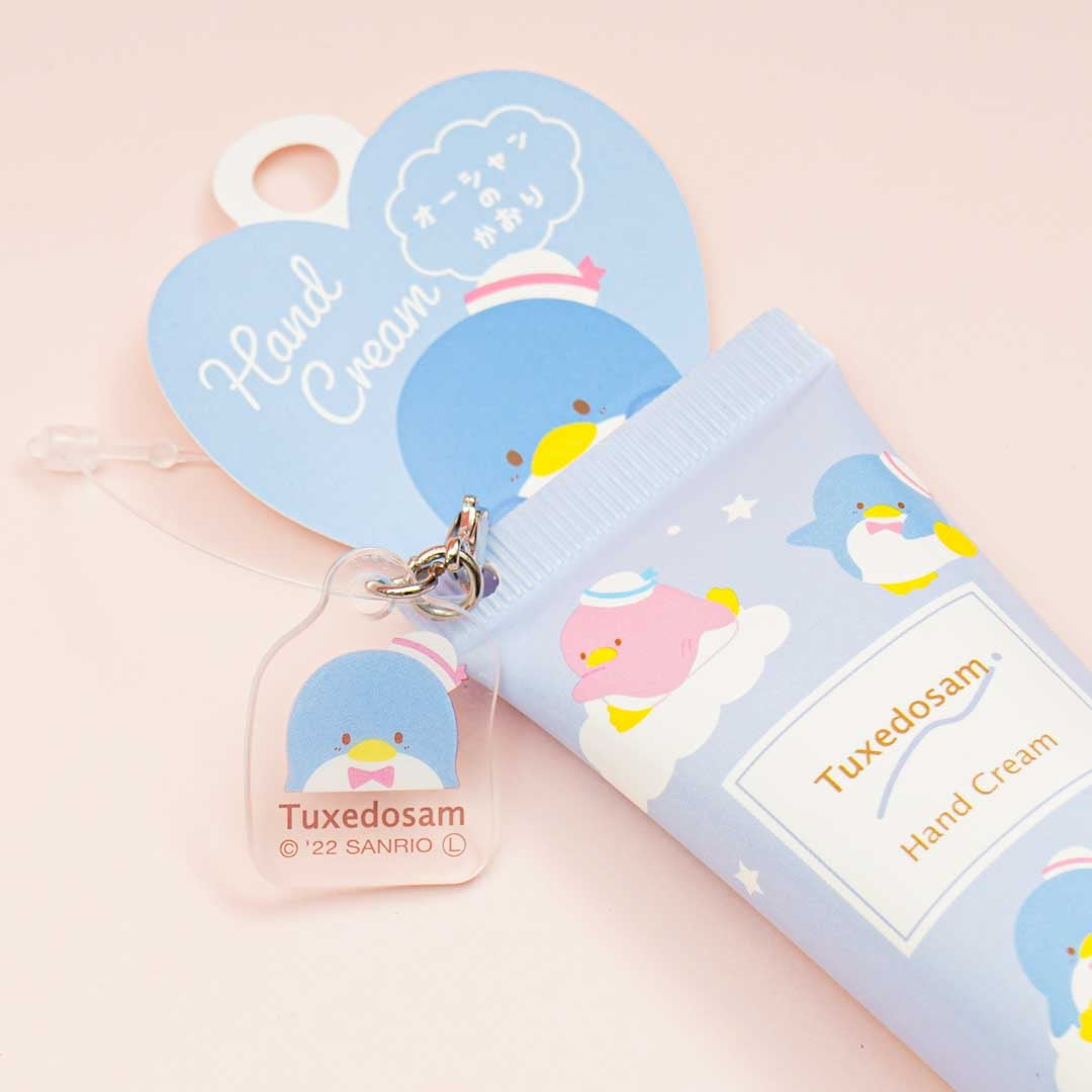 This kawaii tube of hand cream features prints of Tuxedosam and his friends playing among the clouds! Use this cream to keep your hands nice and soft. It has a nice ocean fragrance scent and it has a charm decorated with a print of Tuxedosam.