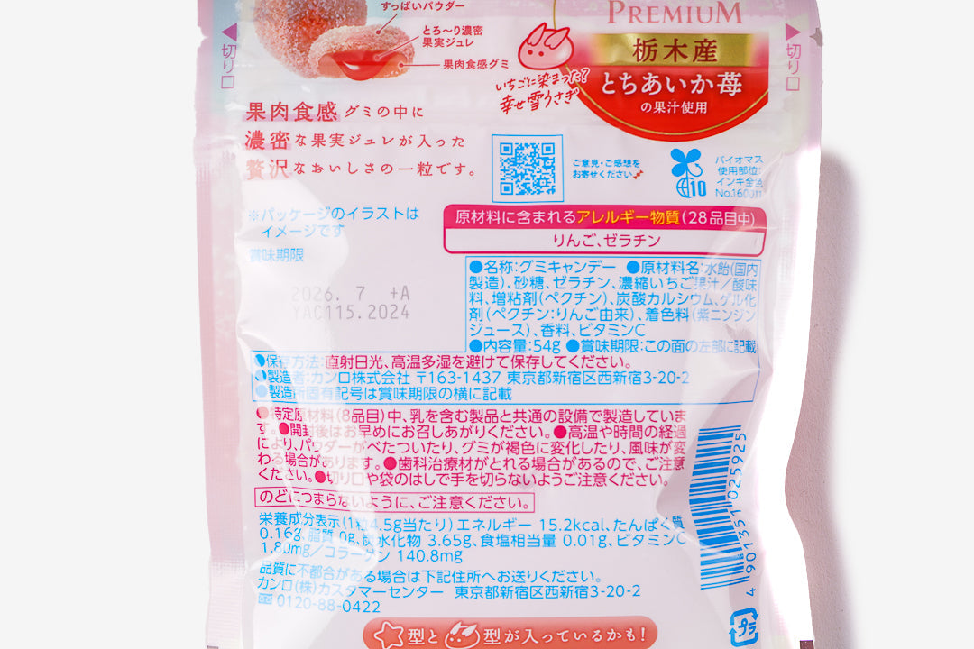 Enjoy these soft gummies made with real Tochiaika strawberry juice from Tochigi Prefecture. Each piece has a gentle, sweet-and-sour taste and a juicy texture that slowly melts as you chew!