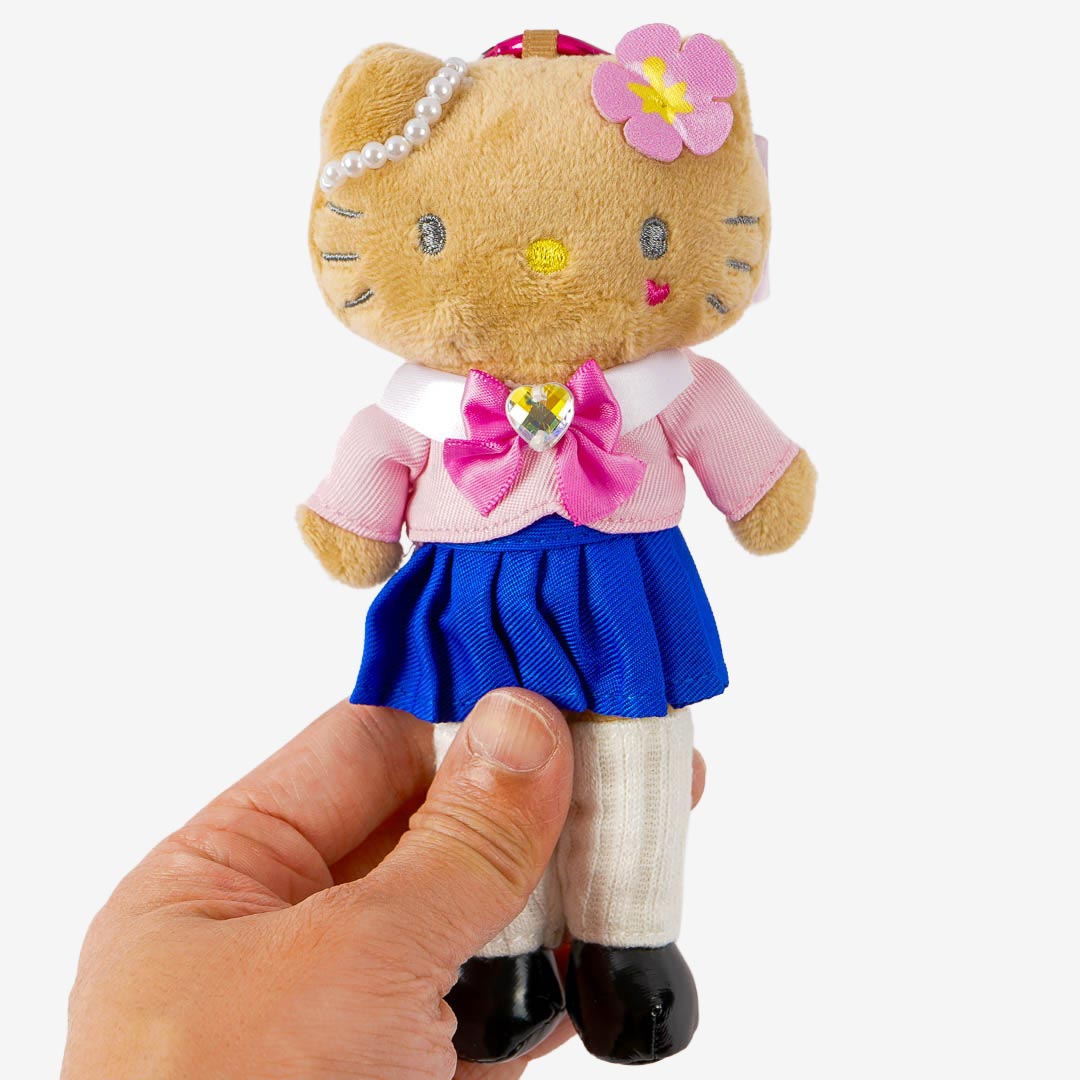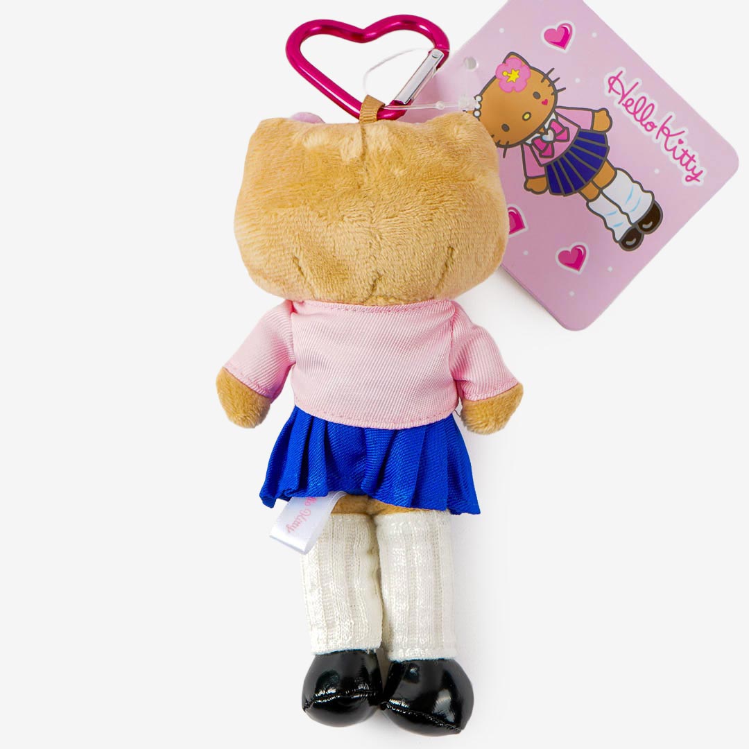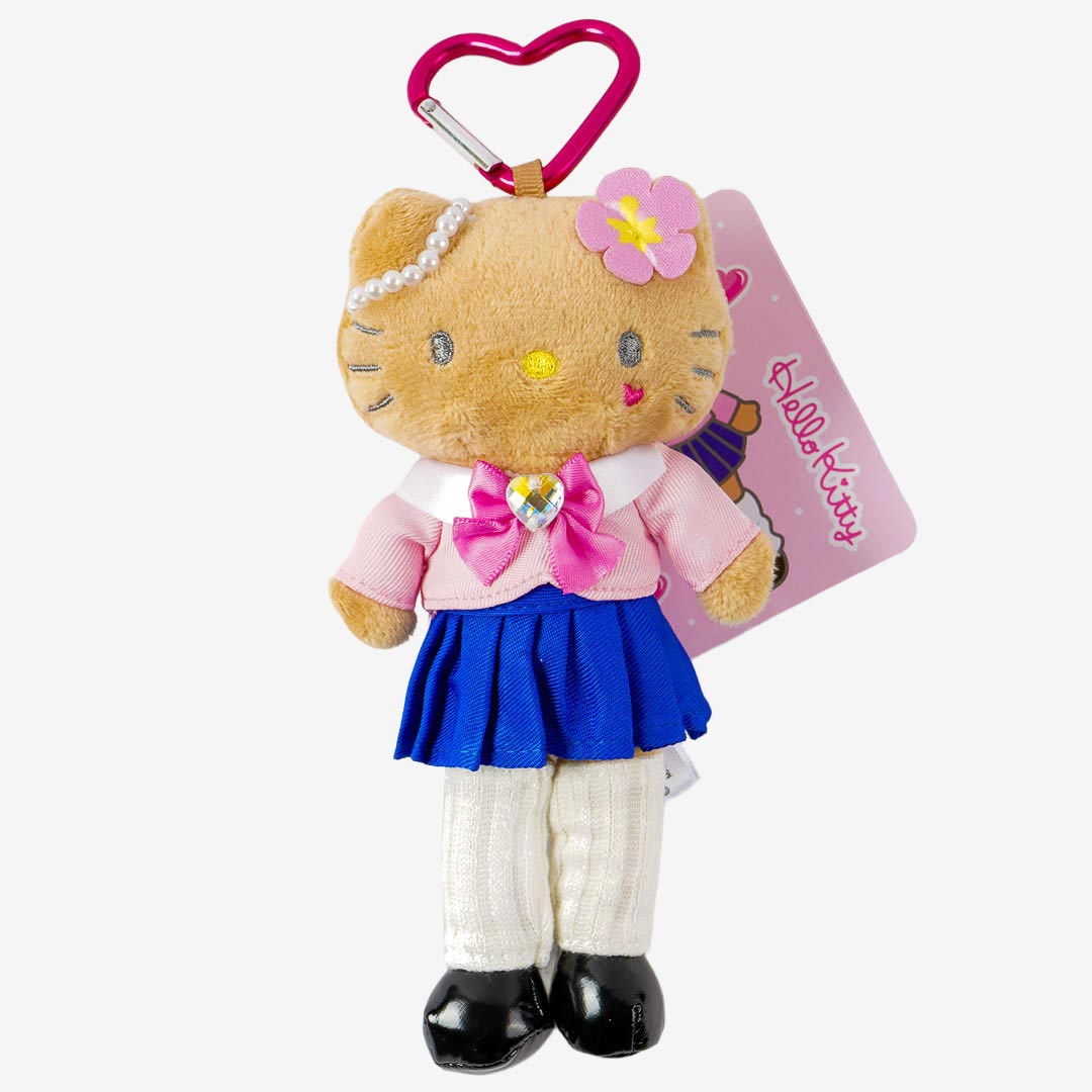 Jazz up your backpack with this suntanned Hello Kitty plushie! It's dressed as a schoolgirl with pearl and tropical flower accessories. This charm comes with a heart-shaped carabiner that you can easily remove if you want to play with the plushie!