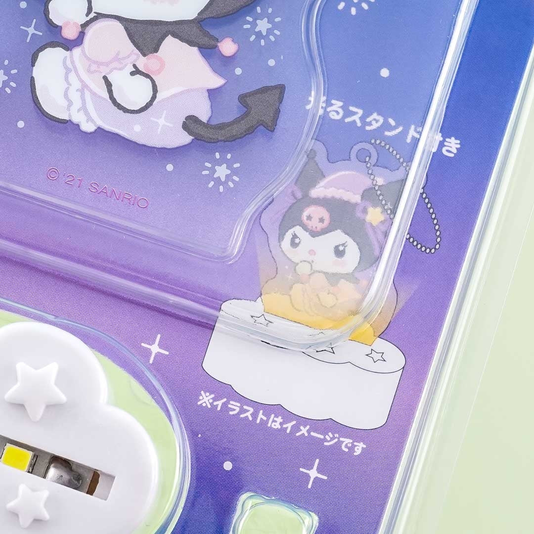 Use this cute die-cut acrylic charm of a blushing Kuromi wiggling her tail to kawaii-fy both your bag and room! It comes with a removable ball chain and a small light-up stand. The detachable base has an on-and-off switch at the bottom and runs on three LR44-size batteries.