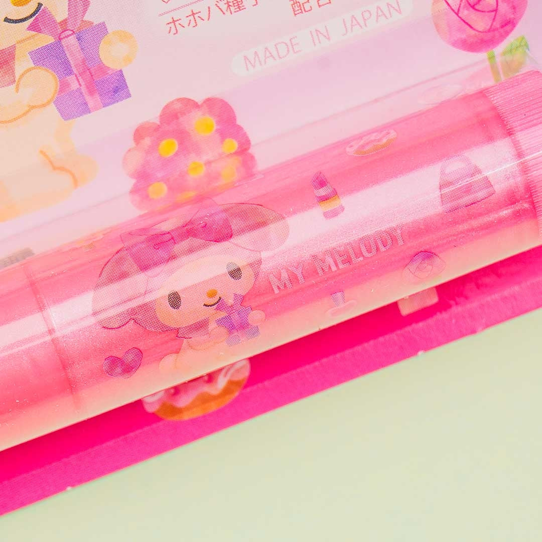 Use this cute stick of lip balm illustrated with My Melody to keep your lips nice and soft. It's made with moisturizing ingredients like olive fruit oil, shea butter, and jojoba seed oil. This lip balm has a nice vanilla scent.