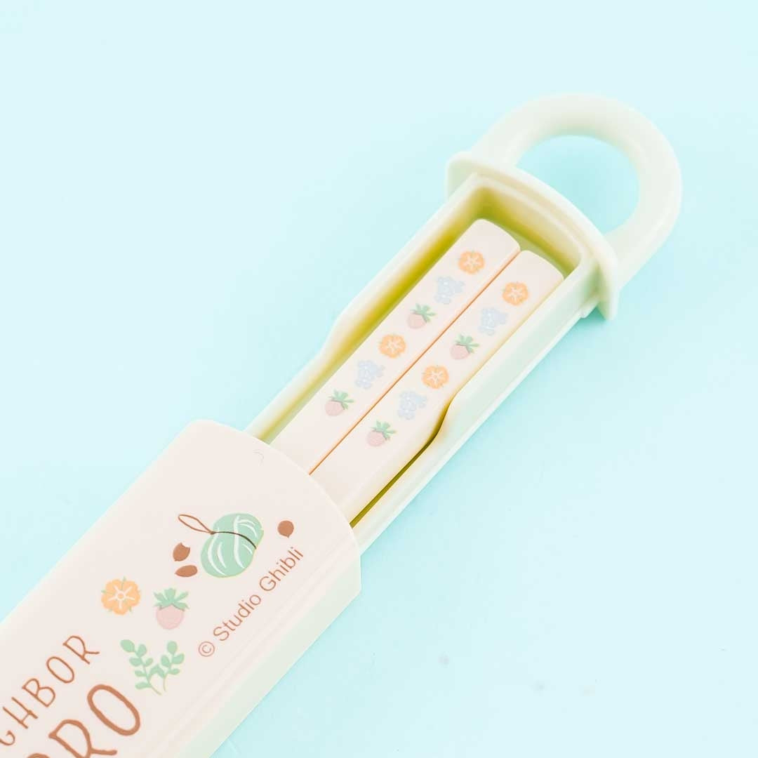 A kawaii chopsticks set with illustrations of Totoro, Chu-Totoro, soot sprites, leaves, and flowers