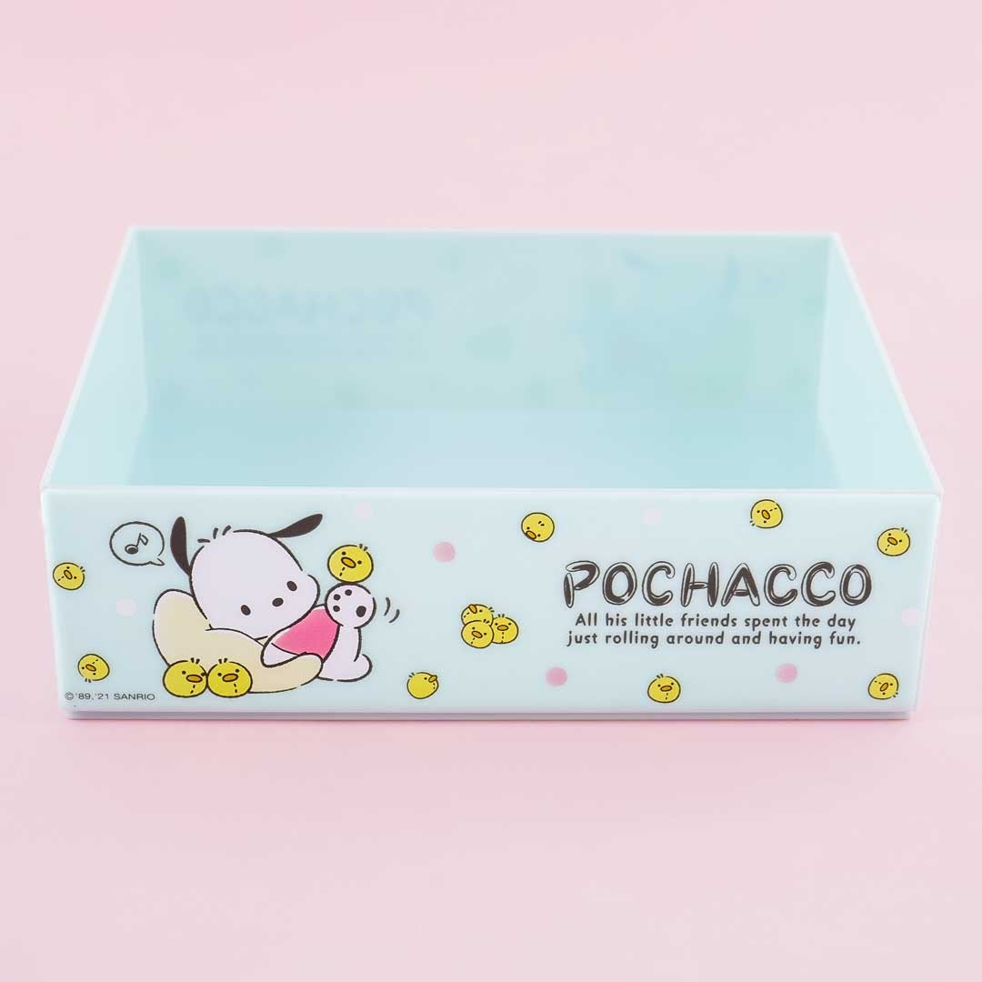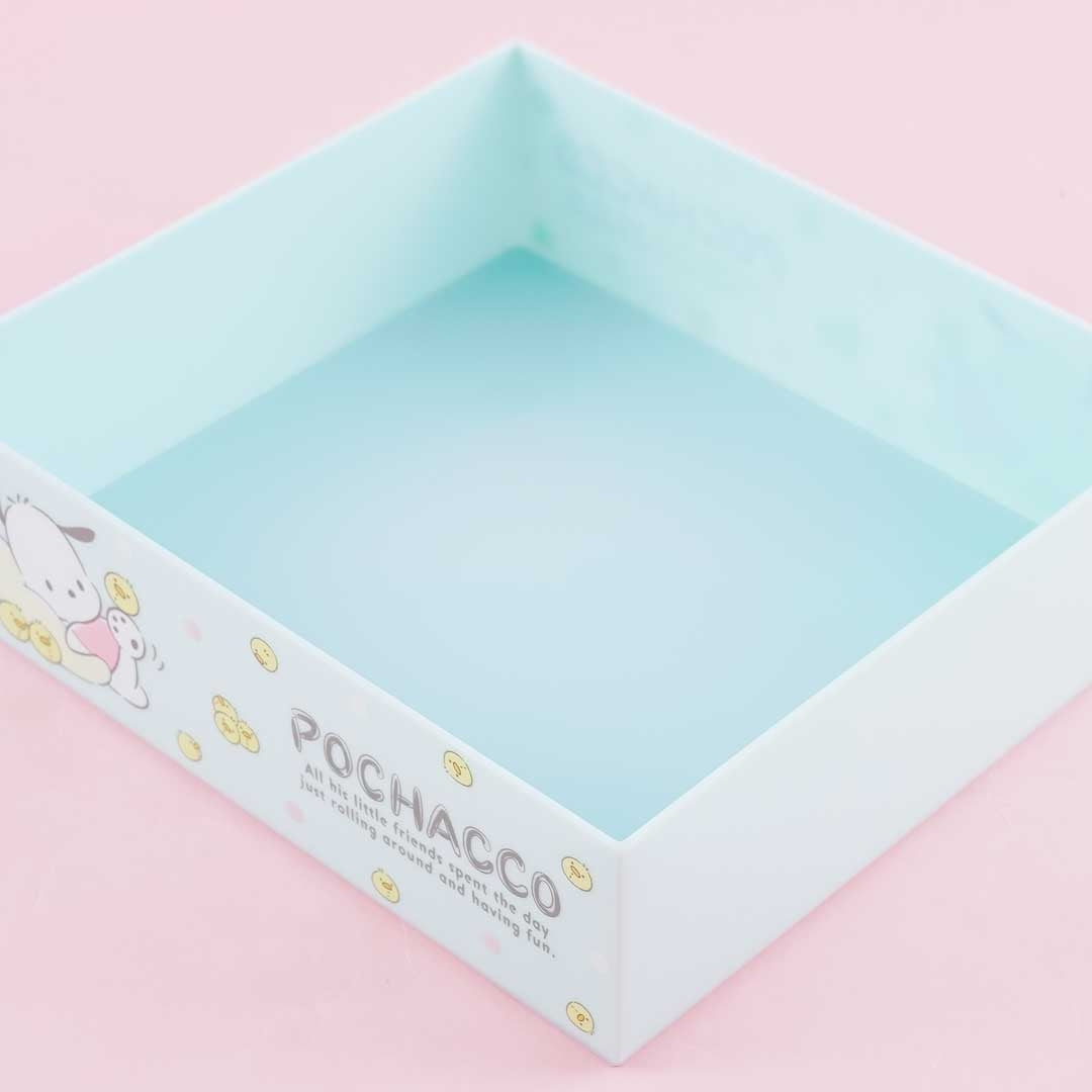 Always place your documents, stapler, highlighter, and other office stuff inside this cute medium-sized storage box! It’s decorated with illustrations of Pochacco playing with ball-shaped yellow chicks called The Pi-chans! This durable resin container does not come with a lid but you can stack it with boxes from the same series.
