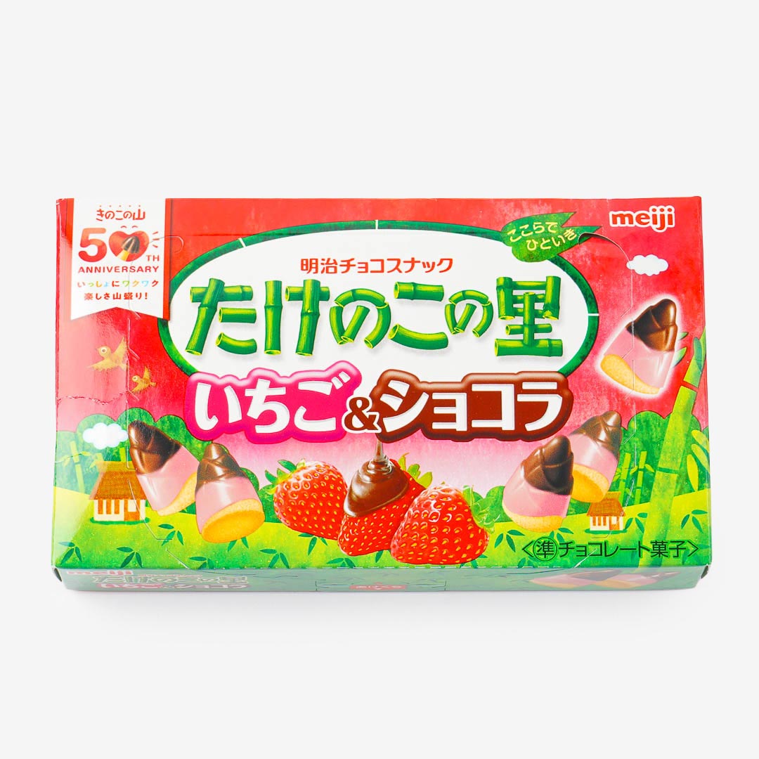 Take a bite out of these tasty biscuits covered in milk chocolate and strawberry cream! These biscuit snacks are called takenoko no sato or bamboo shoot village because of their shape.