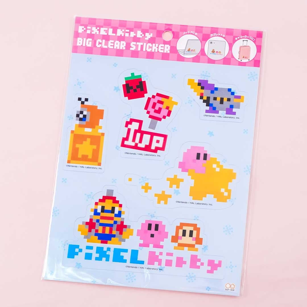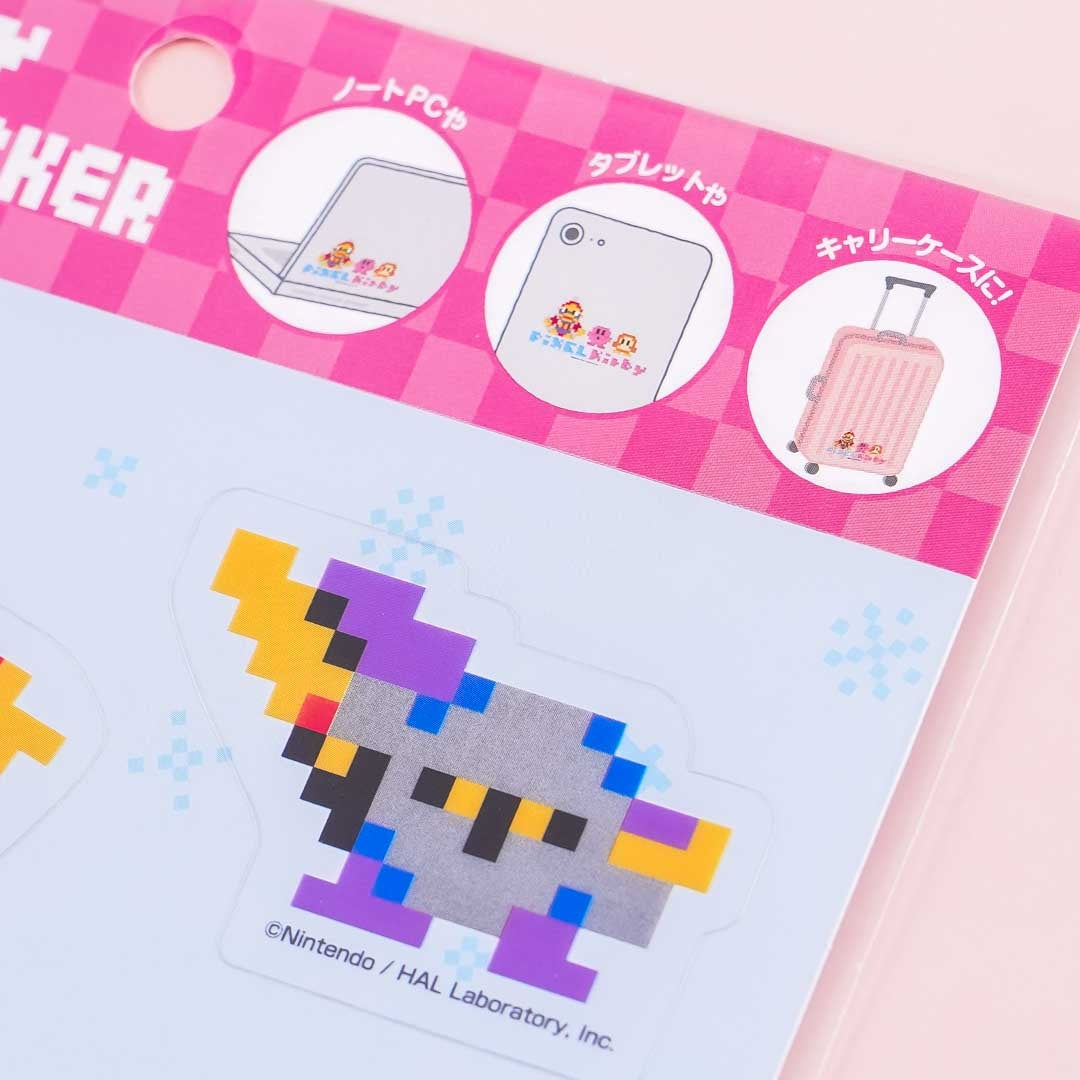 • A cute sheet of stickers showcasing pixelated prints of Kirby