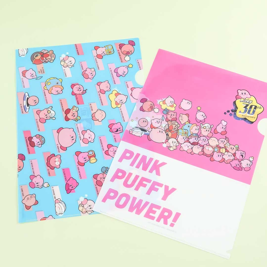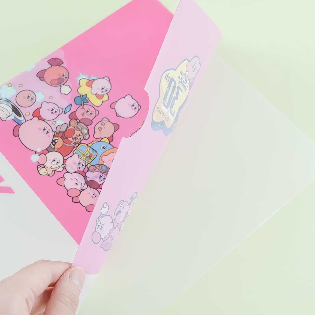 Paper documents are so much easier to organize when you have this cute clear file set! It celebrates Kirby's 30th Anniversary. This file set has two folder with different designs featuring Kirby.