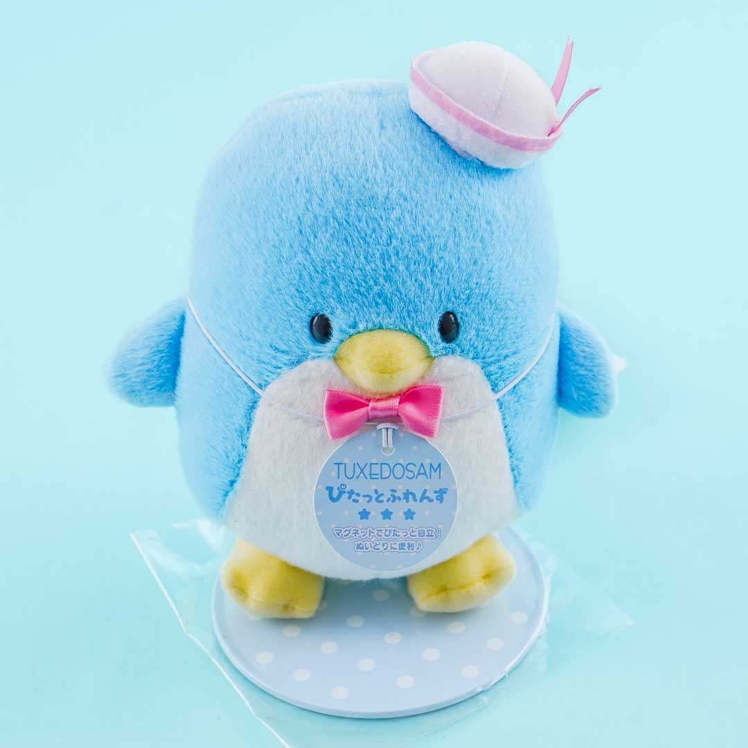 Add this super kawaii Tuxedosam plushie to your stuffed toy collection. This medium-sized cutie has magnets inside its feet so that it can stand on the base!