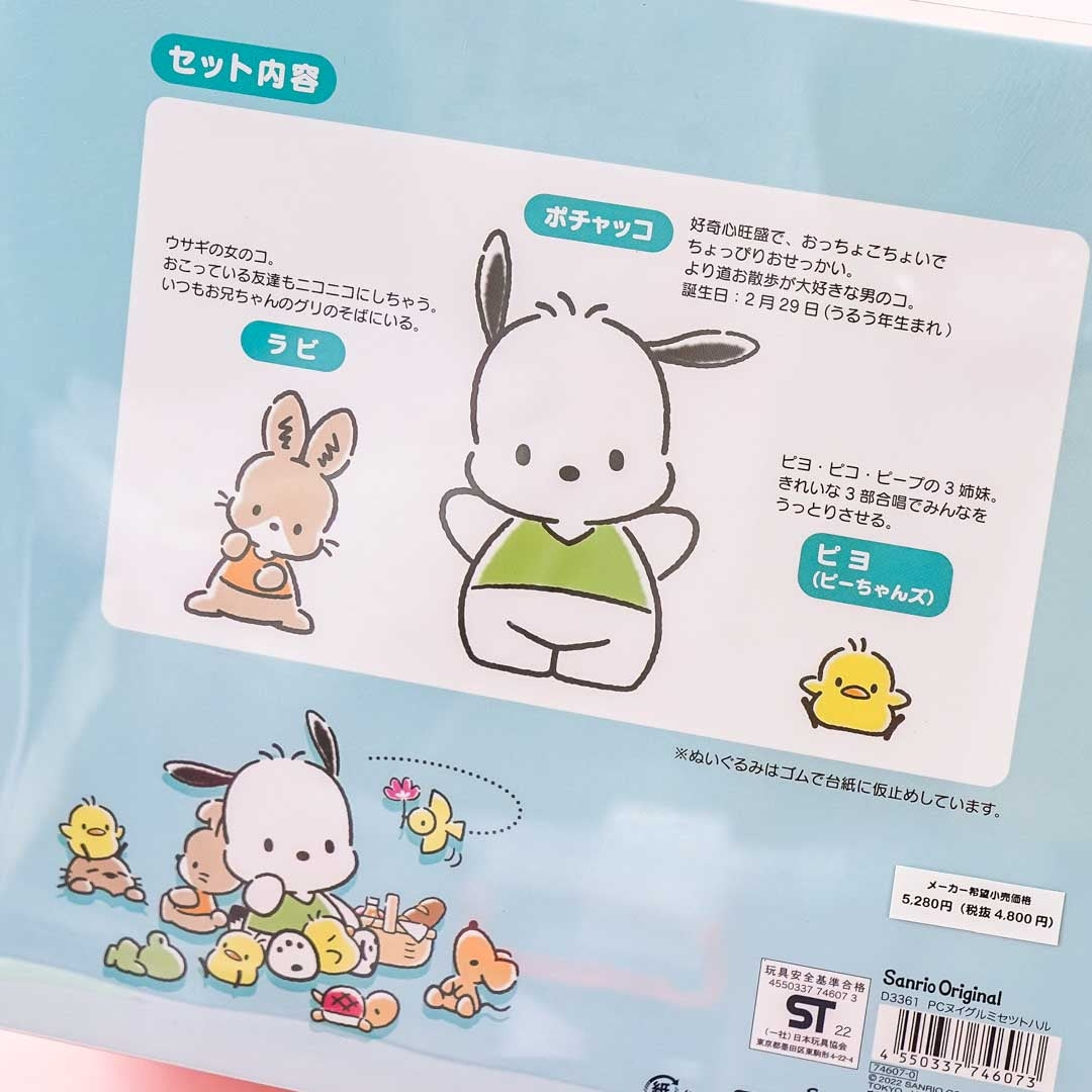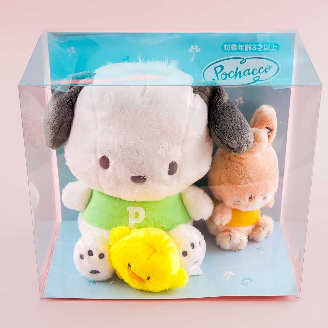 A kawaii set of plushies featuring Pochacco, Rabbi the rabbit, and Piyo the chick