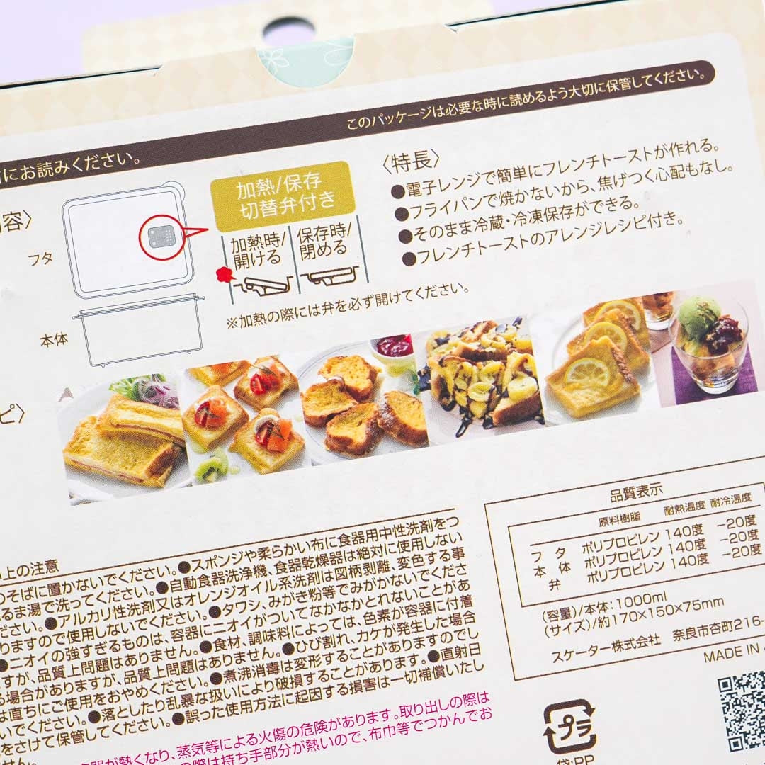 Make your own breakfast in the microwave with this french toast maker illustrated with Pokemon and flowers! Its lid has a switching valve for both heating and storage. Remember, this french toast maker is not safe to clean in the dish washer and dryer.