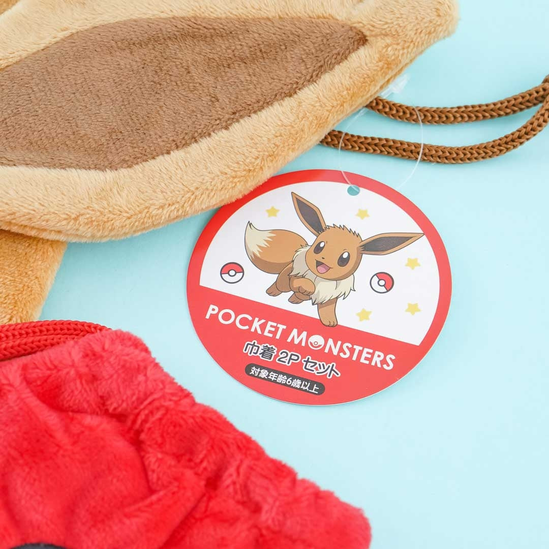A cute set of plushie-like drawstring bags featuring Eevee with pop-out ears and a pokéball