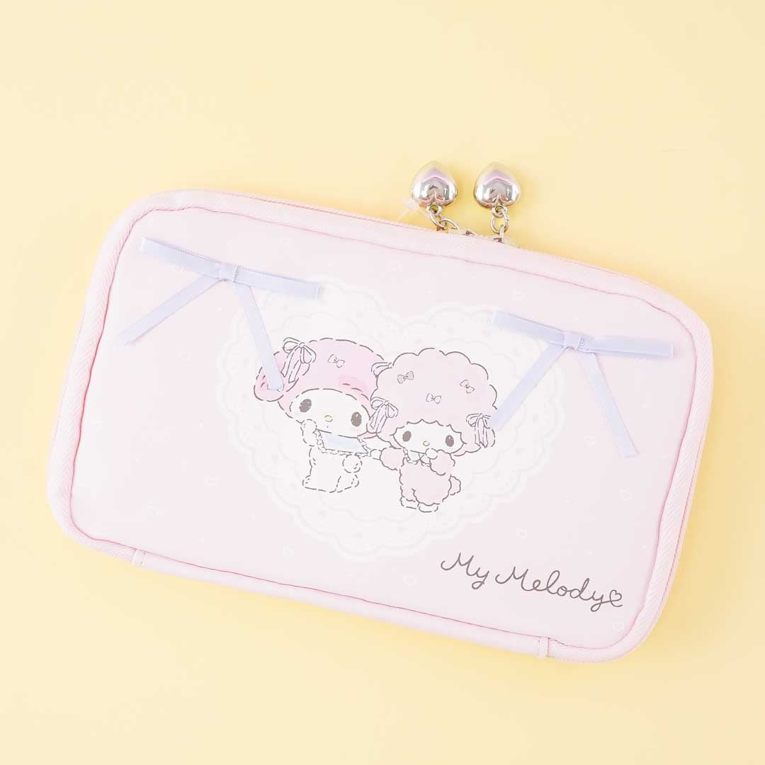 A kawaii pouch illustrated with My Melody and My Sweet Piano with ribbons all over them