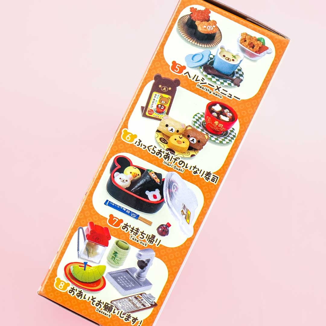 Add this super kawaii Rilakkuma miniature set to your display case! This collectible comes from the "Rilakkuma Sushi Restaurant" miniature series which features Rilakkuma and his friends as parts of sushi sets. It includes a recommendation set, a salmon set, an akami & roll set, a fried chicken set, a healthy menu set, an inari sushi set, a take-out set, and a dessert set. Each miniature is highly detailed.