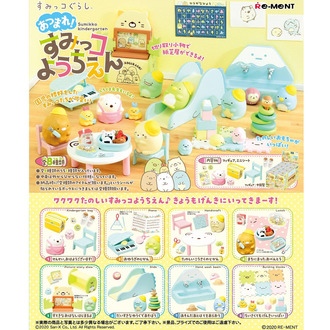 The super cute "Sumikko Gurashi Kindergarten" series features the Sumikko Gurashi gang as children playing in a kindergarten! The items in the series include miniatures of the Sumikko Gurashi characters, toys, a piano, a table set, a slide set, a puzzle mat play area, a blackboard, a sink, and school things. Each replicated mini item is highly-detailed. This series has eight super cute miniatures that you can collect to complete the Sumikko Gurashi kindergarten school. Re-Ment miniatures are popular keepsakes in Japan because of their cuteness and meticulous attention to detail. Each package comes blind-boxed so every order is a wonderful surprise!