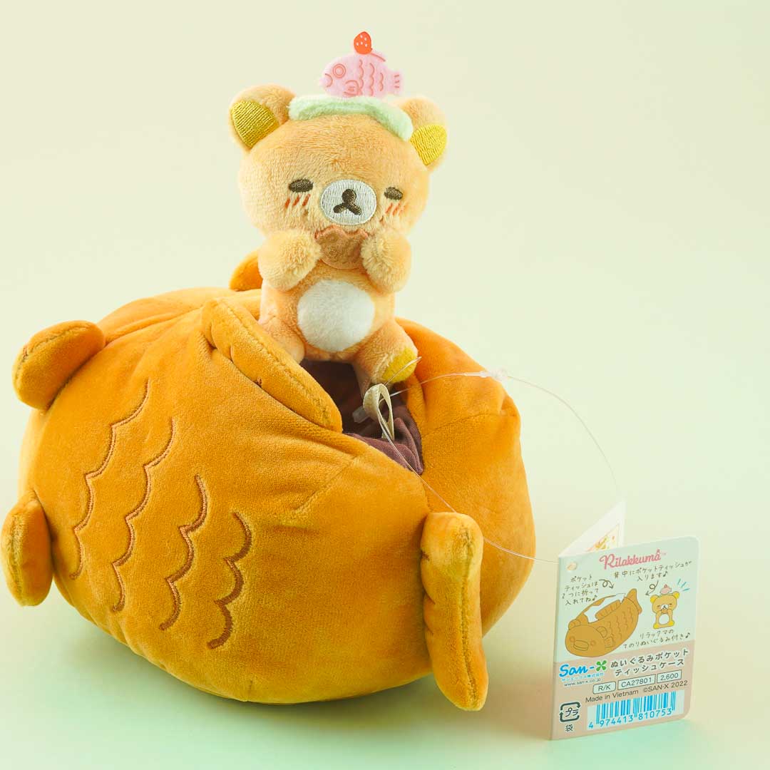 Keep your pocket tissues inside this super cute Taiyaki-shaped soft case! It also comes with a removable mini Rilakkuma plushie.
