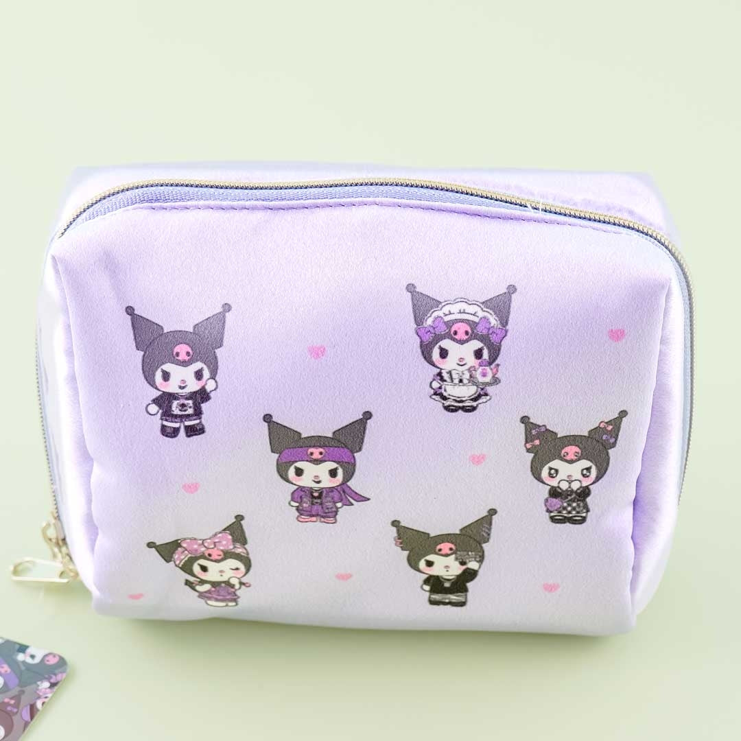 Use this super cute zippered pouch to store your cosmetics during travel. It has two inner pockets and features the charming Kuromi in wearing various kawaii outfits!