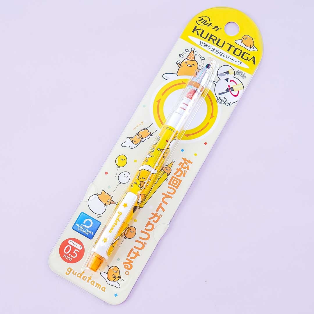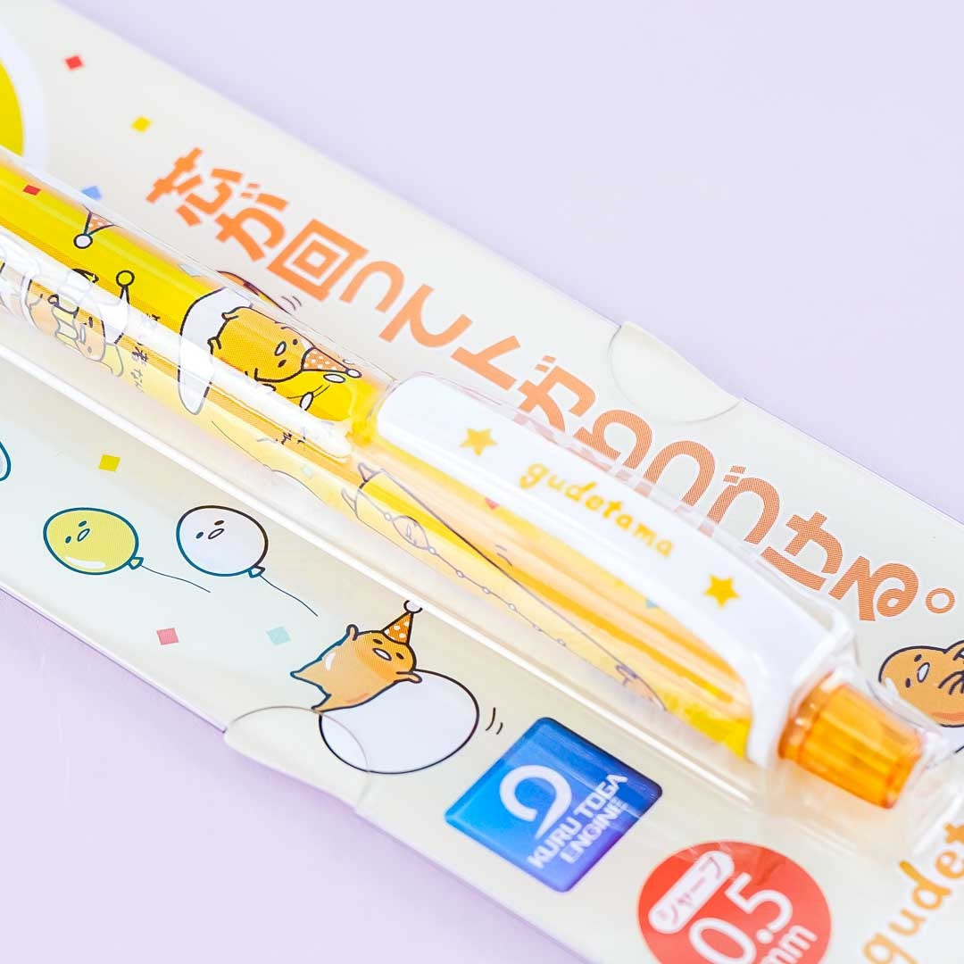 Practice doodling with this super cute mechanical pencil covered in prints of Gudetama having a party! This mechanical pencil features the Japanese Kuru Toga mechanism. It has an inner gear that rotates the lead when it's pressed on paper so that you maintain a cone-shaped tip resistant to breaking!