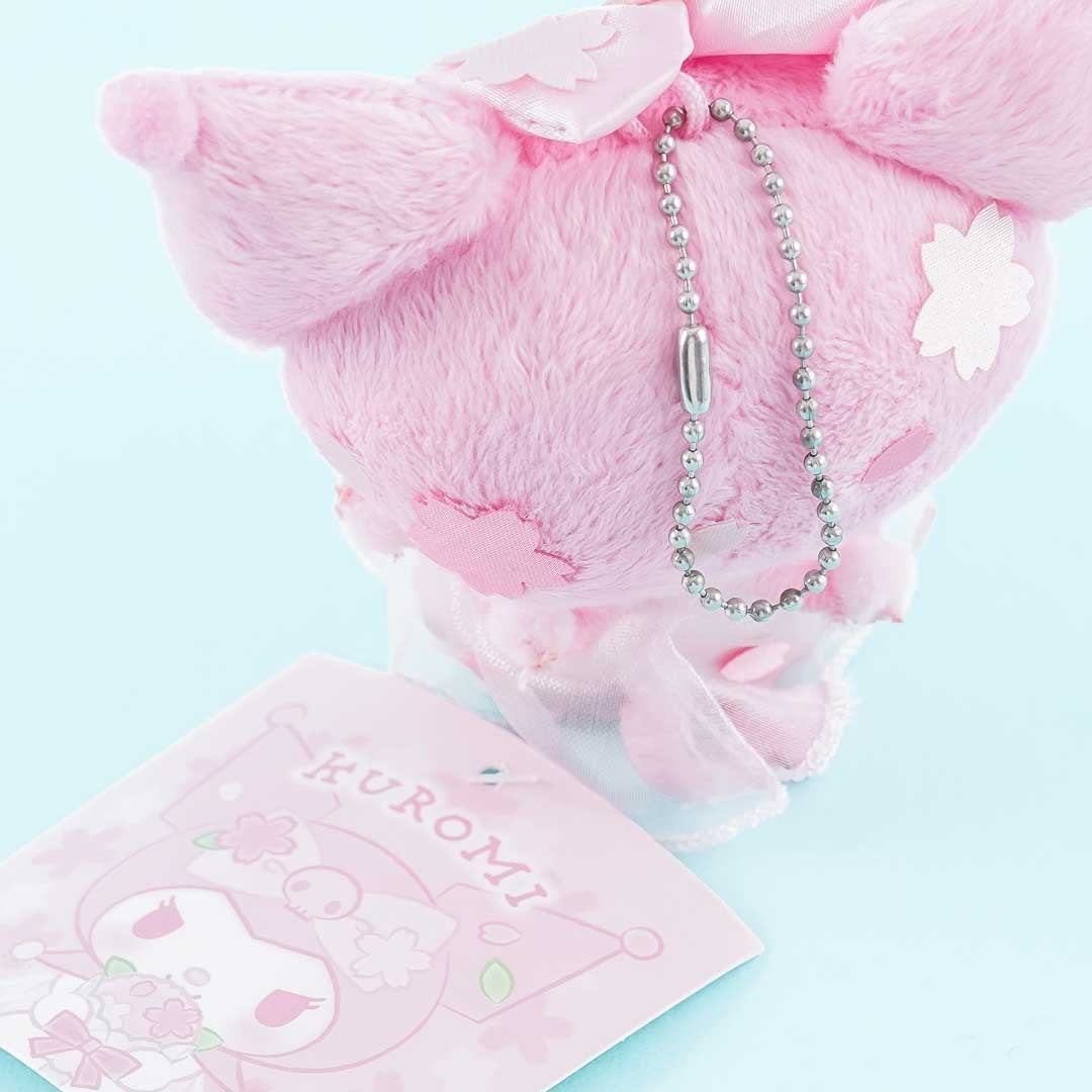 Add this super kawaii medium-sized Kuromi plushie wearing sakura accessories to your collection of stuffed toys! It's also carrying a lovely flower bouquet. Attach this plushie to your favorite bag with its removable ball chain.