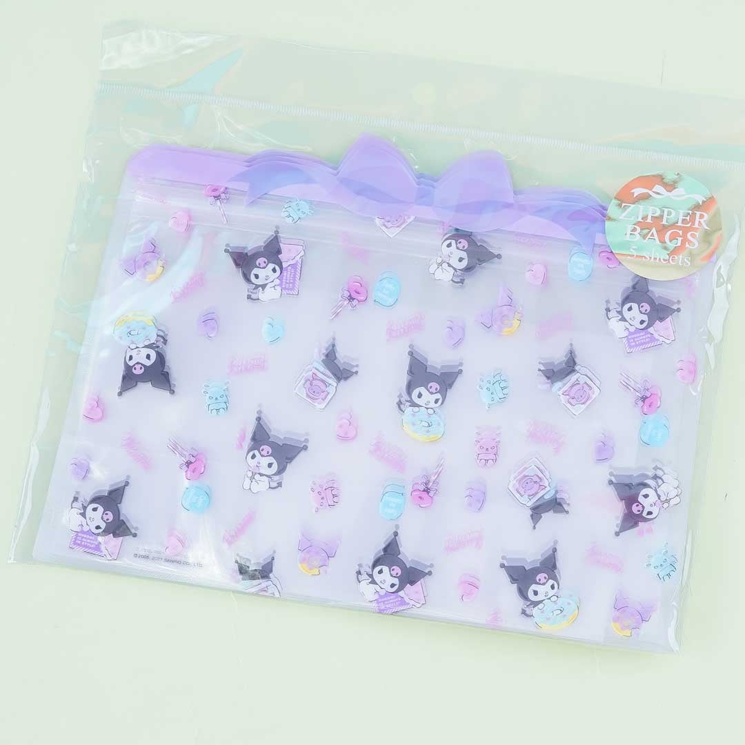 • A set of resealable plastic bags with prints of Kuromi and various sweets