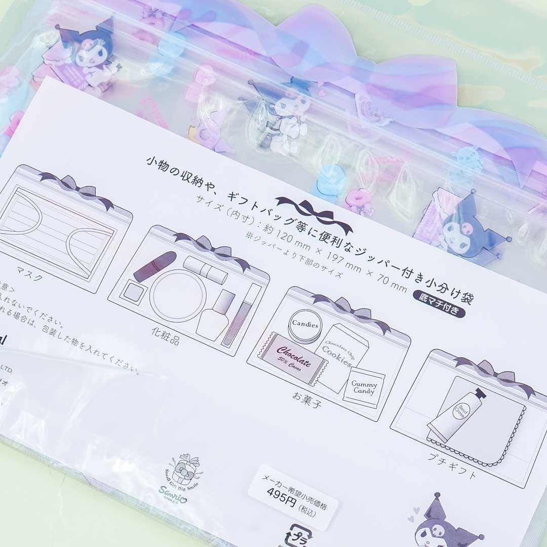 This set of resealable bags is decorated with illustrations of Kuromi and different desserts like chocolate bars, donuts, and lollipops! It also has a kawaii huge ribbon illustration at the top. Store your spare face masks, small cosmetic items, and even snacks in these plastic packs when traveling.