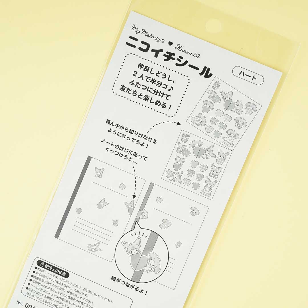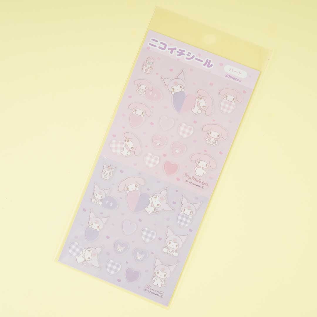 A super cute sheet of stickers decorated with prints of Kuromi and My Melody holding hearts