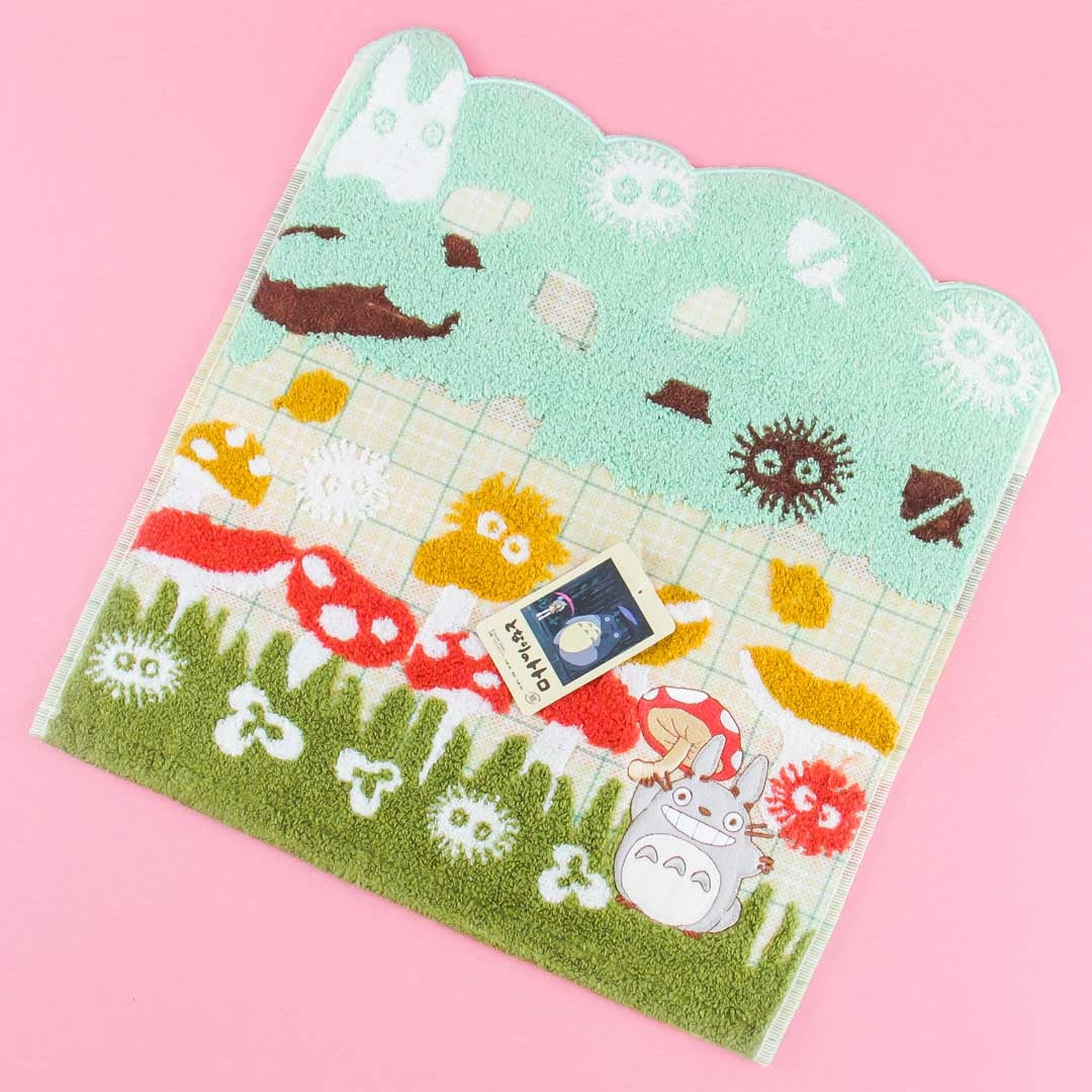 A hand towel featuring Totoro in a grassland filled with mushrooms