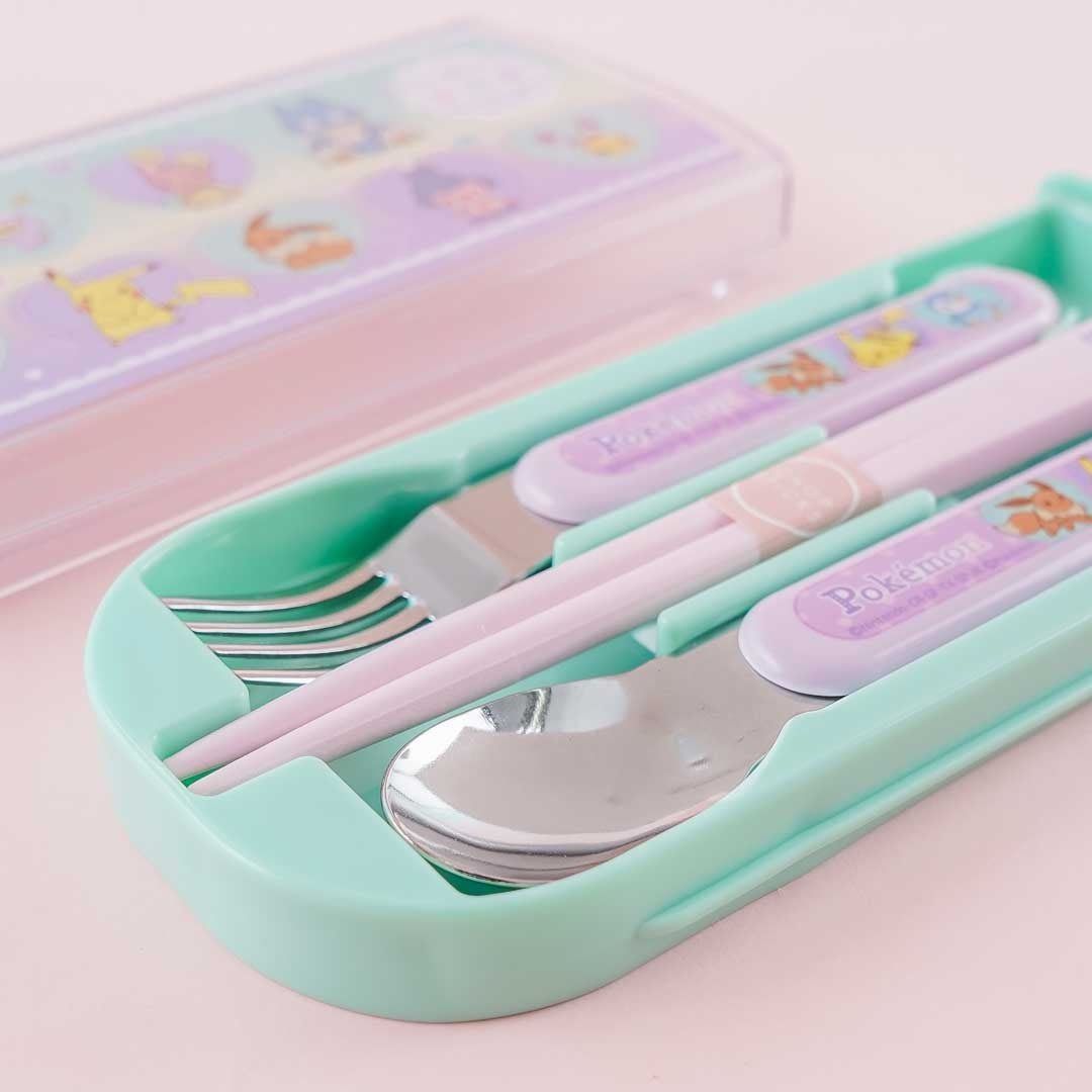 A kawaii utensil set illustrated with Pokemon and heart bubbles